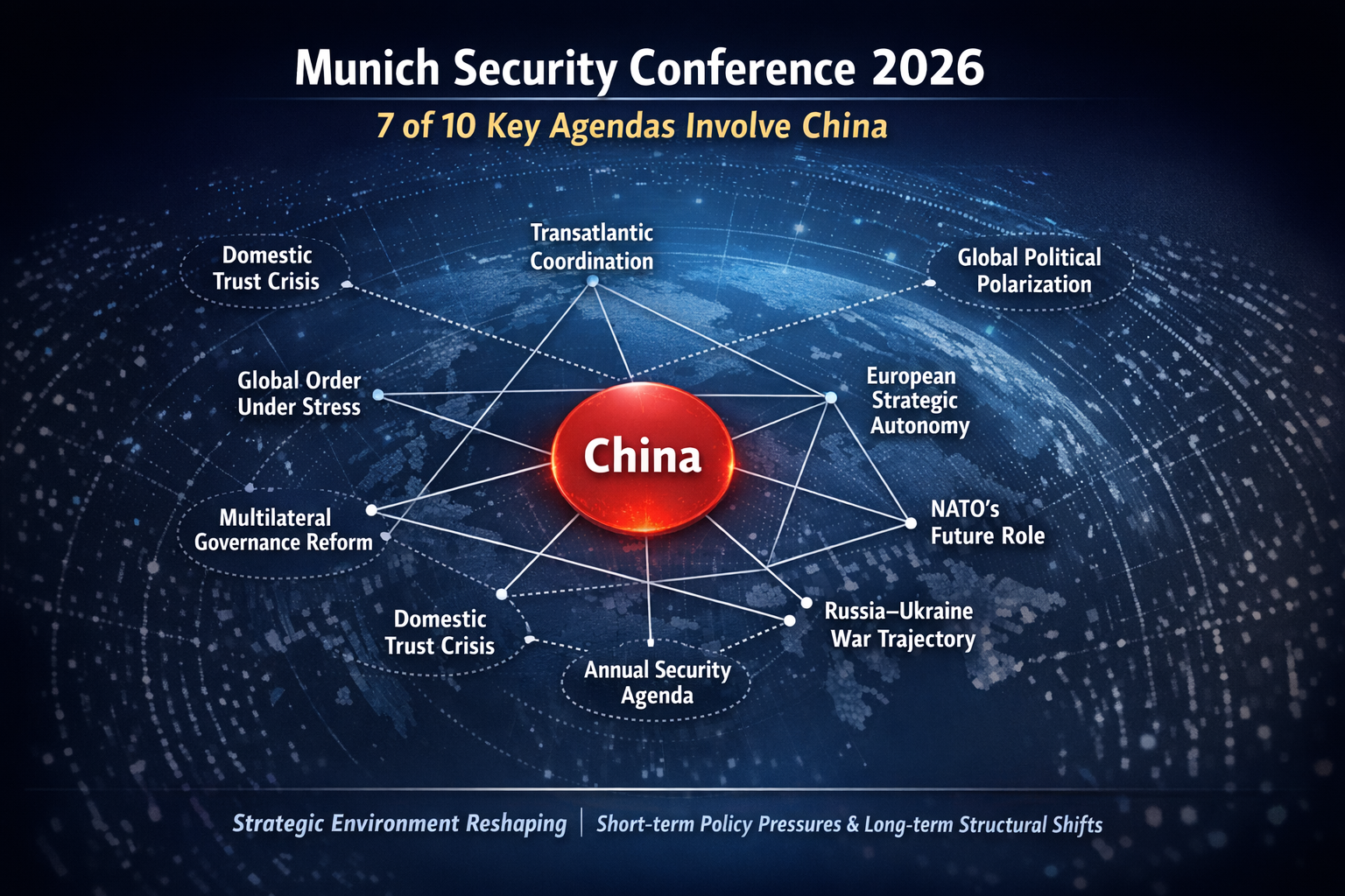 当欧洲在慕尼黑讨论自身安全未来时,中国已成为七成核心议题背后的关键变量。 文/毕研韬 第62届慕尼黑安全会议于2026年2月13日至15日在德国慕尼黑召开,来自120多个国家的政要、专家与安全界人士。会议在全球战略持续震荡、跨大西洋联盟面临深刻调整的背景下展开,被认为是检视当前国际安全格局走向的年度关键论坛。 一、“破坏性政治”与全球秩序的诊断 慕安会主办方在会前发布的《2026年慕尼黑安全报告》以“破坏性政治”为分析框架,认为世界主要安全与治理机制正受到来自内部和外部的双重冲击,传统规则基础受到侵蚀。报告特别指出,国际体系的不稳定性正在上升,各方在合作与竞争之间的张力加剧。 二、对跨大西洋关系的重新校准 跨大西洋合作是本届会议反复被提及的主题。大会开幕时,会议主席沃尔夫冈·伊辛格指出当前美欧关系处于十字路口,传统的合作模式正在被重新审视。多个欧洲国家领导人呼吁美国回归理性联盟政策,同时强调欧洲应在北约内部增强话语权和责任分担。 三、对欧洲防务自主性的探索 德国总理默茨与法国总统马克龙在会议期间就加强欧洲防务自主性进行了实质磋商,包括对欧洲核威慑机制的可能性展开对话。这一系列讨论反映出在美国战略重心转向印太的背景下,欧洲在安全保障上寻求更大独立性。 四、北约角色与联盟机制的未来 北约在会议中依然是核心议题,北约秘书长吕特强调欧洲在未来安全架构中需要承担更重要的角色,强调增强联盟内部协调的必要性。与会各方就如何调整北约以应对新的地缘战略挑战进行了广泛对话。 五、俄乌战争的战略走向 俄乌冲突仍是本届会议的中心议题之一。德国总理默茨在会议上表示,俄罗斯可能要等其经济或军事能力“枯竭”后才能结束战争,这反映出欧洲对持续冲突的现实评估。同时,乌克兰外交部长和中国外交部长在会议期间就扩大和平对话进行了讨论。 六、多边治理与国际合作机制的压力测试 与会者普遍认为,当前多边机制在应对冲突、危机和全球性风险时显示出疲态。围绕国际法、公平代表制机制的有效性,以及如何推进联合国等机构改革等问题,成为会议中的重要议题。 七、技术与网络安全议题的上升 不同于传统只聚焦军事安全的讨论,本届会议更显著地将技术安全与网络空间的稳定性纳入主舞台。随着全球战略竞争向数字和技术层面扩展,技术安全被视为未来全球安全架构的重要组成部分。 八、中国立场与和平倡议的表达 在会议的“中国专场”上,中国外交部长王毅强调通过对话与政治解决一切地区热点,包括乌克兰问题,并强调多边主义和国际法治的重要性。这一立场阐述了中国关于全球治理的价值主张与解决国际纷争的策略思路。 九、民意与战略信任呈现危机 《2026年慕尼黑安全报告》同时指出,不仅是国家间的战略矛盾,近年来西方内部对政治体系和治理能力的信任不断下降,这加剧了政策一致性的困难。报告揭示了政治极化、社会分裂等因素对国际合作的间接影响。 十、会议影响对未来一年安全议程的指向 尽管会议本身不会发布正式的公报,但广泛的交流和公开论述本身就对2026年全球安全议程具有重要指向作用。特别是在大国关系、跨大西洋合作机制调整、欧洲安全自主性构建等领域,与会者的讨论很可能在未来一年内转化为政策走向。...