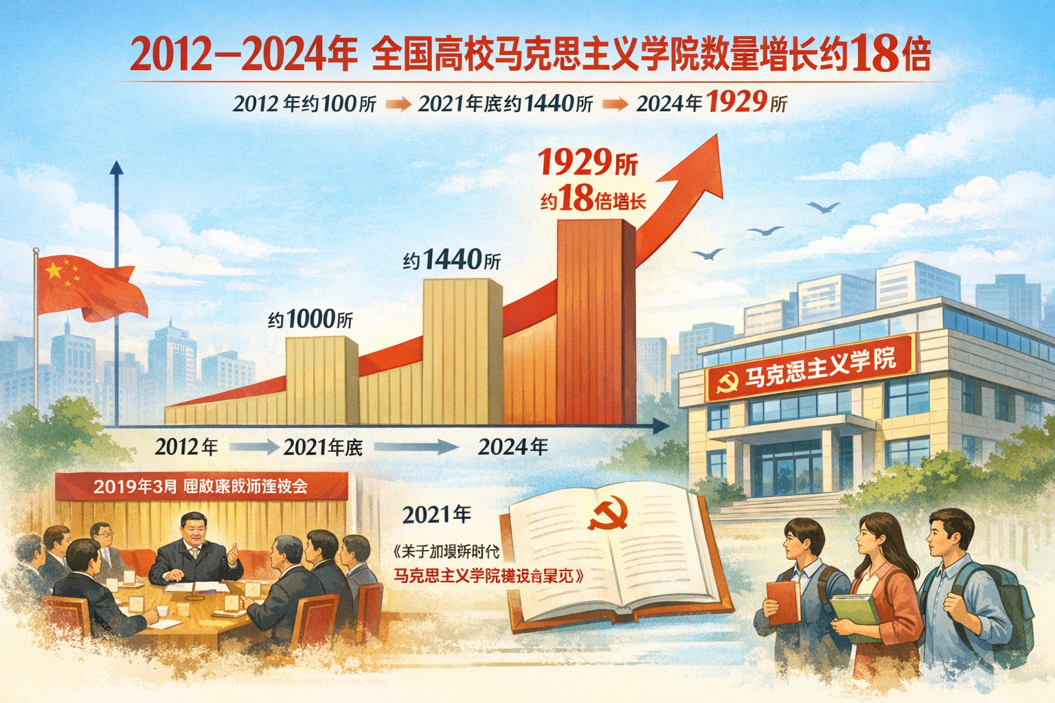 2026-02-14文/《无界传播》信息中心 根据中华人民共和国教育部公开数据,2012年全国高校设有马克思主义学院100余所;到2021年底,已增长至约1440所;截至2024年,这一数字达到1929所。若按2012年100所为基数测算,至2024年净增长约18.29倍,总量扩大至约19.3倍。这一扩张速度,在中国高校院系建制演变中具有显著结构意义。 一、阶段性增长轨迹:2012—2021—2024 2012年至2021年,全国高校马克思主义学院数量由约100余所增长至1440余所。按照100所估算,九年间总量扩大约14.4倍。这一阶段完成了由“少量建制”向“普遍建制”的转变。 2021年至2024年,数量由1440所继续增长至1929所,三年净增近500所。尽管增速较前期略有放缓,但仍保持扩张态势。到2024年,马克思主义学院已覆盖绝大多数普通本科高校,并延伸至部分高职院校。 上述数据来源于中华人民共和国教育部新闻发布会及权威媒体公开报道。2012年与2021年的数据见教育部官网发布内容;2024年1929所的数据见权威媒体对教育系统建设情况的报道。 二、2019年:政策转折节点 2019年3月18日,习近平总书记主持召开学校思想政治理论课教师座谈会并发表重要讲话,系统阐述新时代思政课建设的战略定位。官方评论将这一会议视为新时代思政课建设的重要里程碑。 会议之后,高校层面加快推进独立建院、师资专职化、课程体系规范化建设,马克思主义学院由部分高校的教学部门形态,逐步转向标准化院级建制。这一时间节点,与随后数量快速扩张在时间上高度重合。 三、2021年制度文件:结构性巩固 2021年9月,中共中央办公厅印发《关于加强新时代马克思主义学院建设的意见》,对马克思主义学院的功能定位、组织领导、学科建设和保障机制作出系统部署。文件明确提出,将马克思主义学院建设纳入党委责任体系和高校考核评价体系,并强调建设全国重点马克思主义学院发挥示范作用。 这一制度性文件,为数量扩张提供了稳定的政策框架,也使机构建设从阶段性推进转向常态化、制度化运行。 四、结构意义:组织形态的制度化嵌入 从100余所到1929所,数量变化不仅是教育行政层面的扩容,更体现出意识形态教育在高校组织结构中的制度化嵌入。建制形态由依附型教学单位转向独立学院;功能由单一课程教学扩展至教学、研究与宣传多重角色;评价机制由教学考核延伸至党委责任体系。 需要说明的是,2012年100余所为区间表述。本文按100所估算得出“增长约18倍”的结论,属于测算口径。如按110或120所计算,倍数将相应降低。因此在正式文本中注明计算依据更为严谨。 总体来看,2012—2024年的扩张过程呈现出三重逻辑:高位政治推动、制度文件固化、组织结构规范化。其结果,是马克思主义学院在中国高校体系中实现了从边缘配置到全面覆盖的结构性转变。